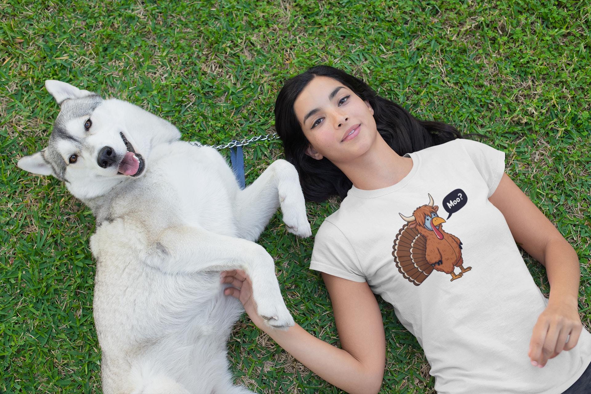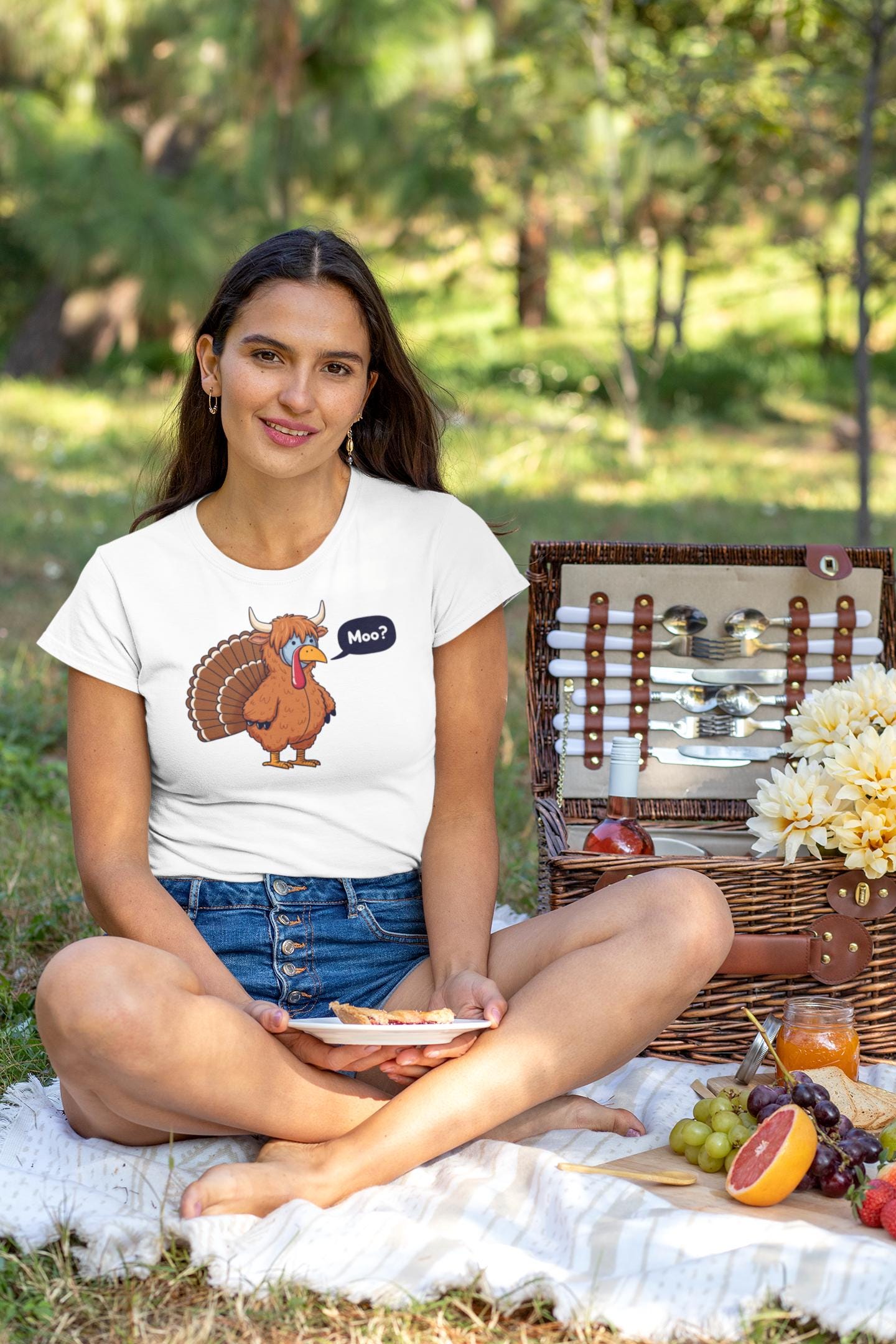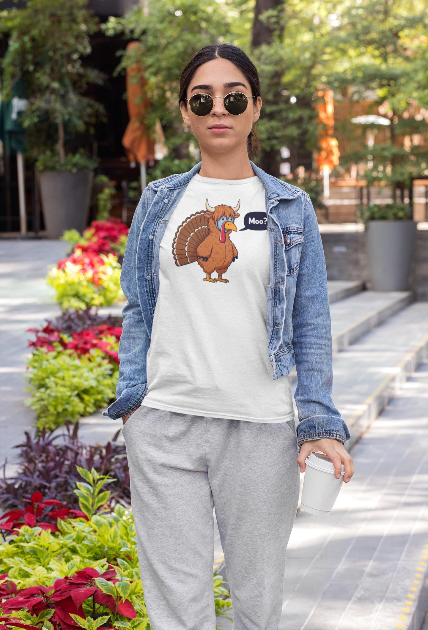 Embrace the humor of the holiday season with our Highland Cow Turkey Disguise T-shirt! This hilarious design features a turkey completely committed to its disguise, sporting luxurious ginger highland cow fur, horns, shaggy bangs, and an adorably innocent “Moo?”